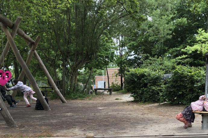 På vores store legeplads er der mulighed for motorisk udfoldelse på vores fodboldbane, store bakke og kuperede terræn, i vores klatretræer og på motorikbanen. Der er mulighed for sanselig udfoldelse i vores forskellige sandkasser, på gyngerne og vores snurretoppe. Hvis det er en mere stille stund eller rolig leg barnet har behov for, er der små hyggelige kroge, legehuse og bålhytten hvor vi ofte laver snacks eller lytter til historier/musik, mens vi nyder varmen fra de fine flammer. Den indeholder: